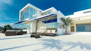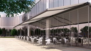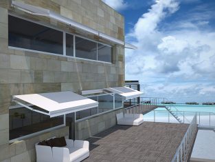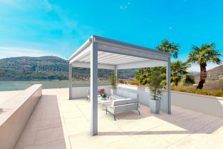 Toldo de moderno diseño concebido especialmente para cubrir grandes superficies como terrazas, patios, piscinas. Preparado para instalar cerramientos laterales.