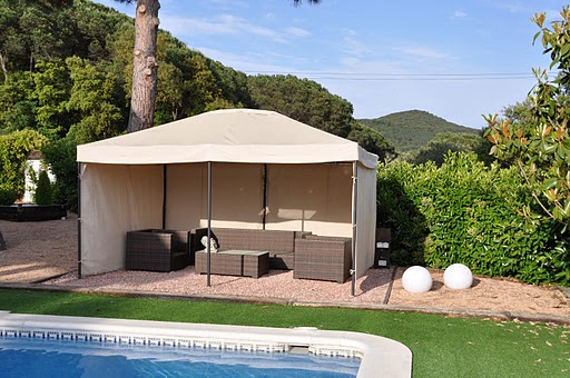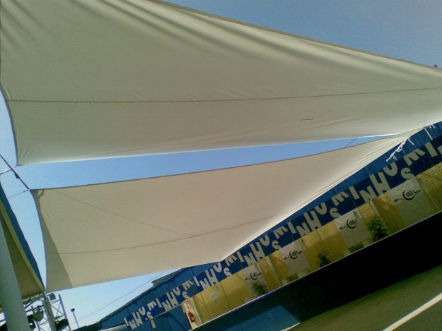 Toldo de moderno diseño concebido especialmente para cubrir grandes superficies como terrazas, patios, piscinas.